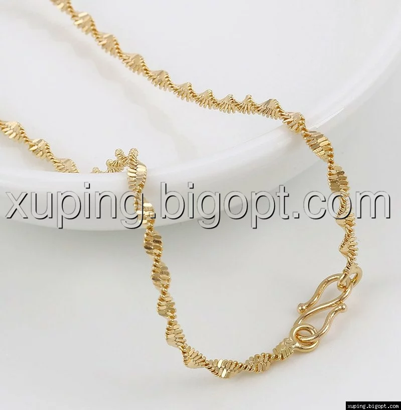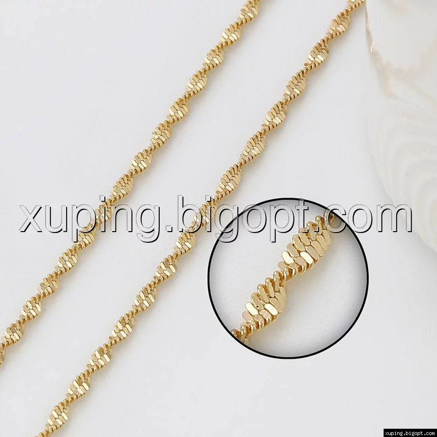 Цепочка выполнена из медицинского сплава на основе латуни с добавлением легирующих элементов, с целью улучшения каких-либо ее свойств, например коррозионной стойкости или прочности. Такой сплав не вызывает аллергии, не вступает в реакцию с потом человека, не меняет свои свойства под воздействием соленой воды и солнца. Поверхность цепочки покрыта золотом 18 карата.
