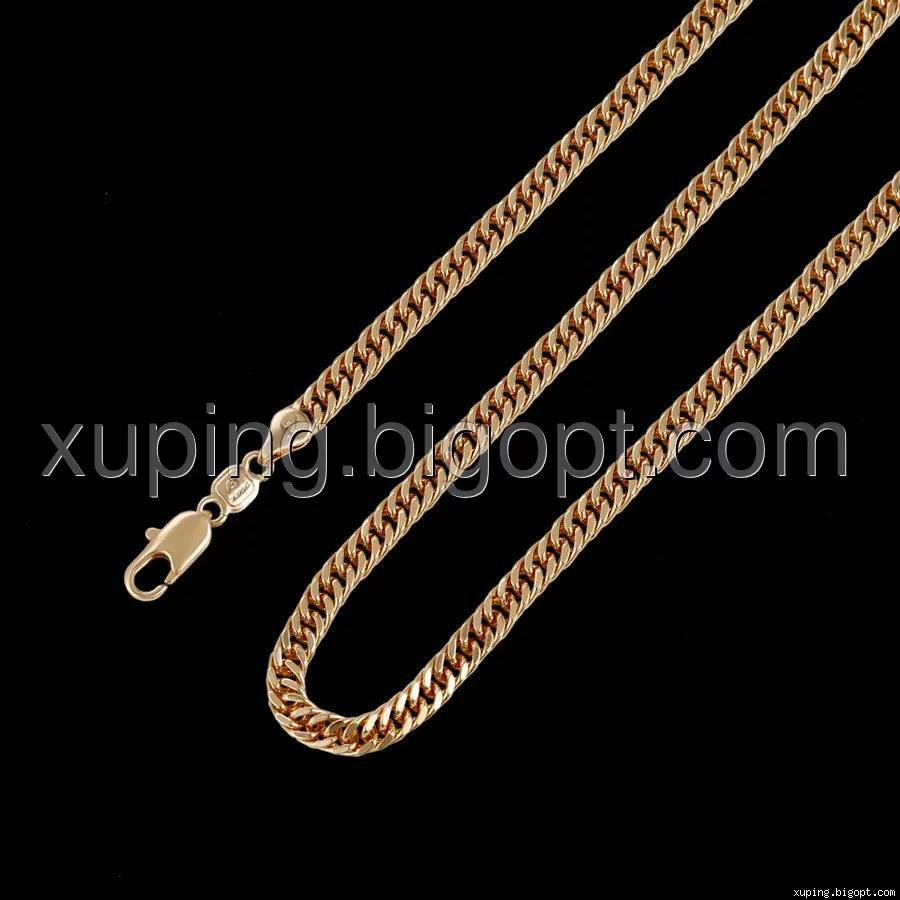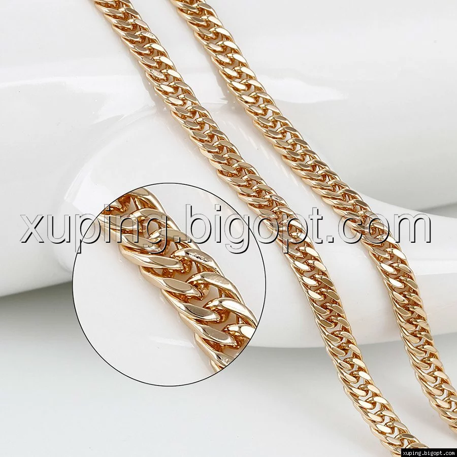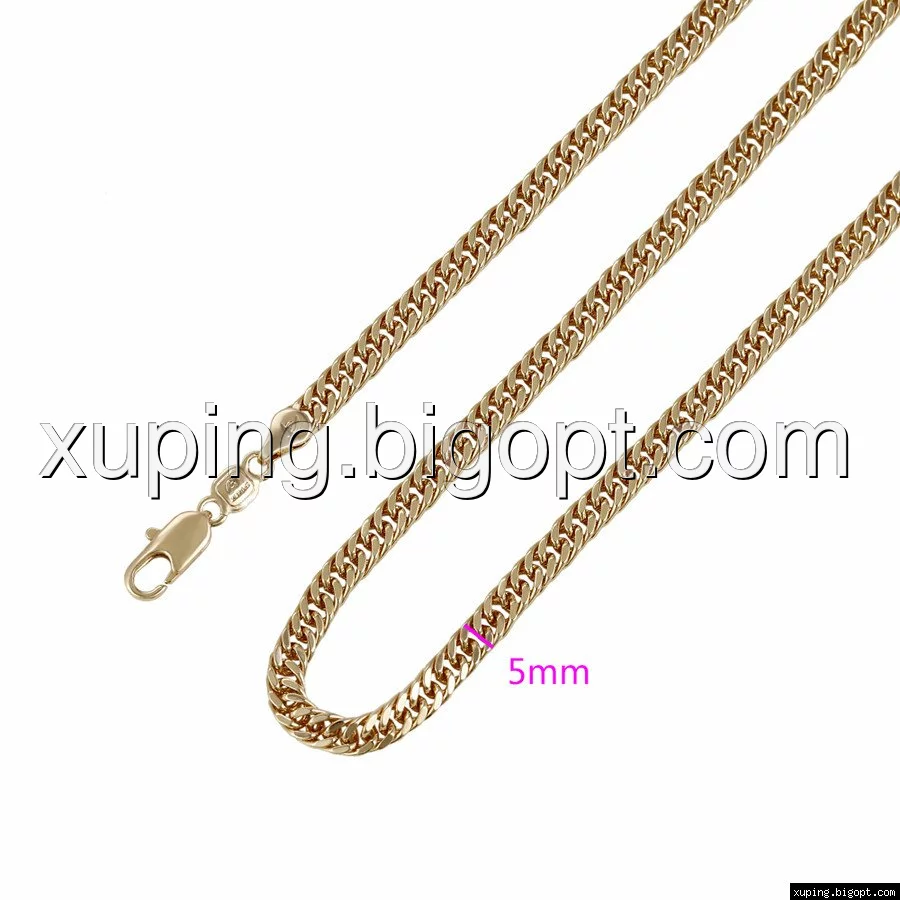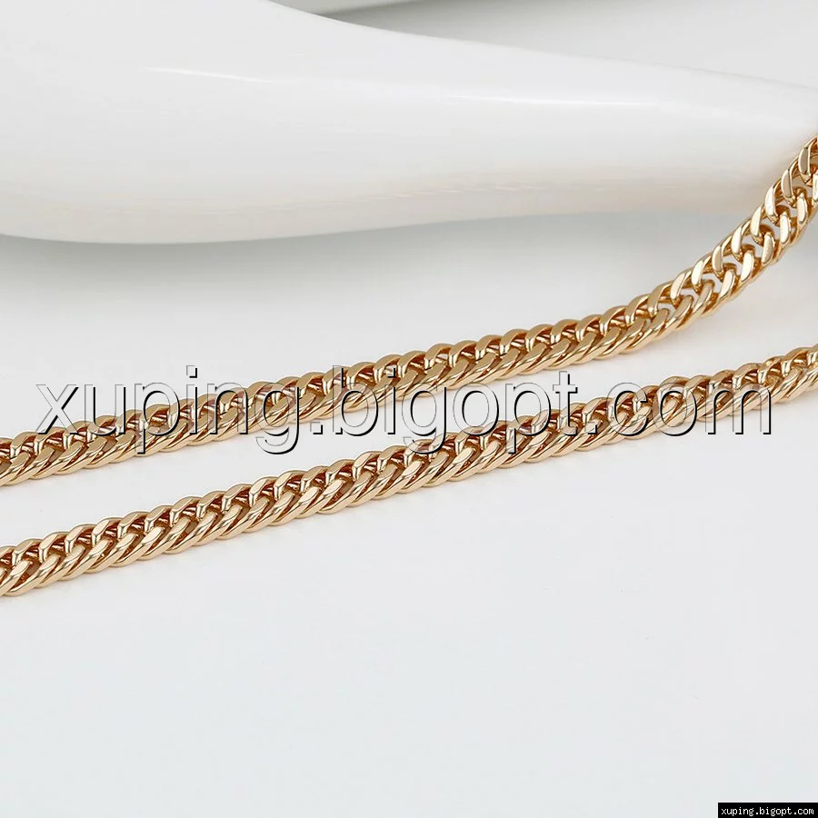 Цепочка выполнена из медицинского сплава на основе латуни с добавлением легирующих элементов, с целью улучшения каких-либо ее свойств, например коррозионной стойкости или прочности. Такой сплав не вызывает аллергии, не вступает в реакцию с потом человека, не меняет свои свойства под воздействием соленой воды и солнца. Поверхность цепочки покрыта золотом 18 карата.