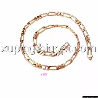 Цепочка выполнена из медицинского сплава на основе латуни с добавлением легирующих елементов, с целью улучшения каких-либо ее свойств, например коррозионной стойкости или прочности. Такой сплав не вызывает аллергии, не вступает в реакцию с потом человека, не меняет свои свойства под воздействием соленой воды и солнца. Поверхность цепочки покрыта золотом 24 карата.