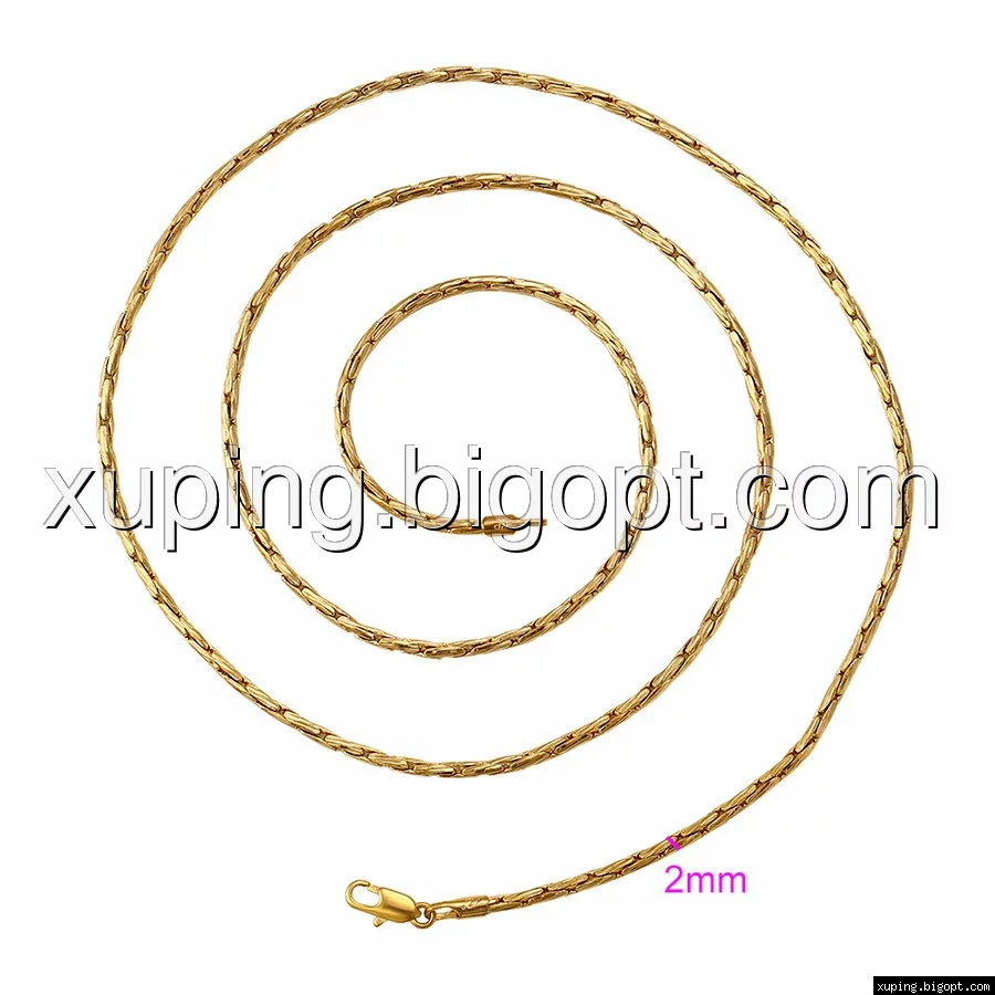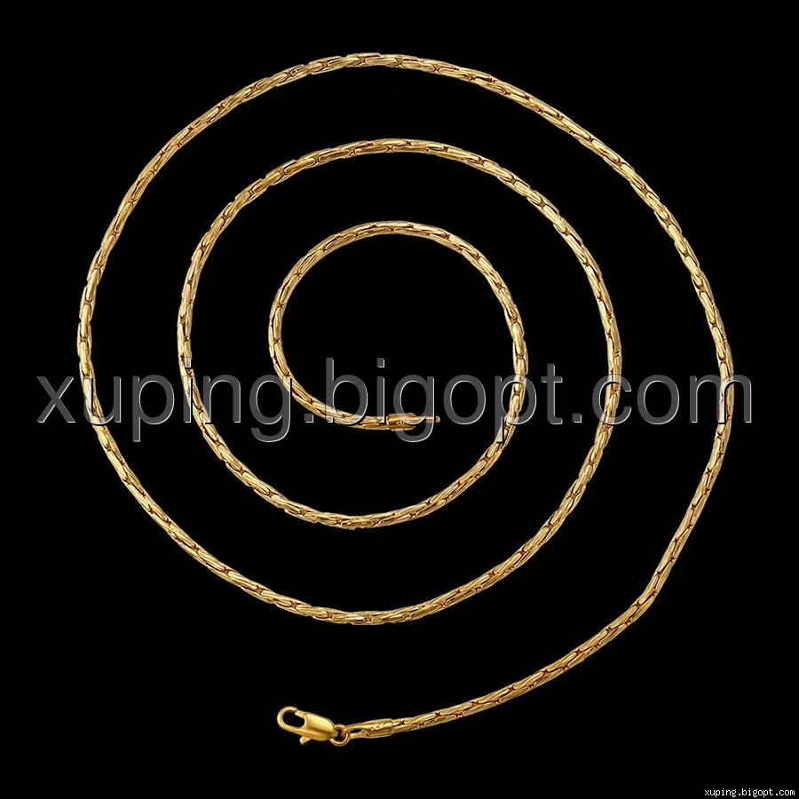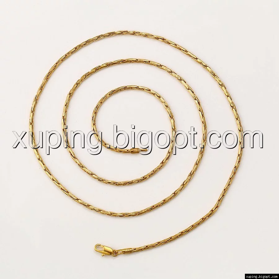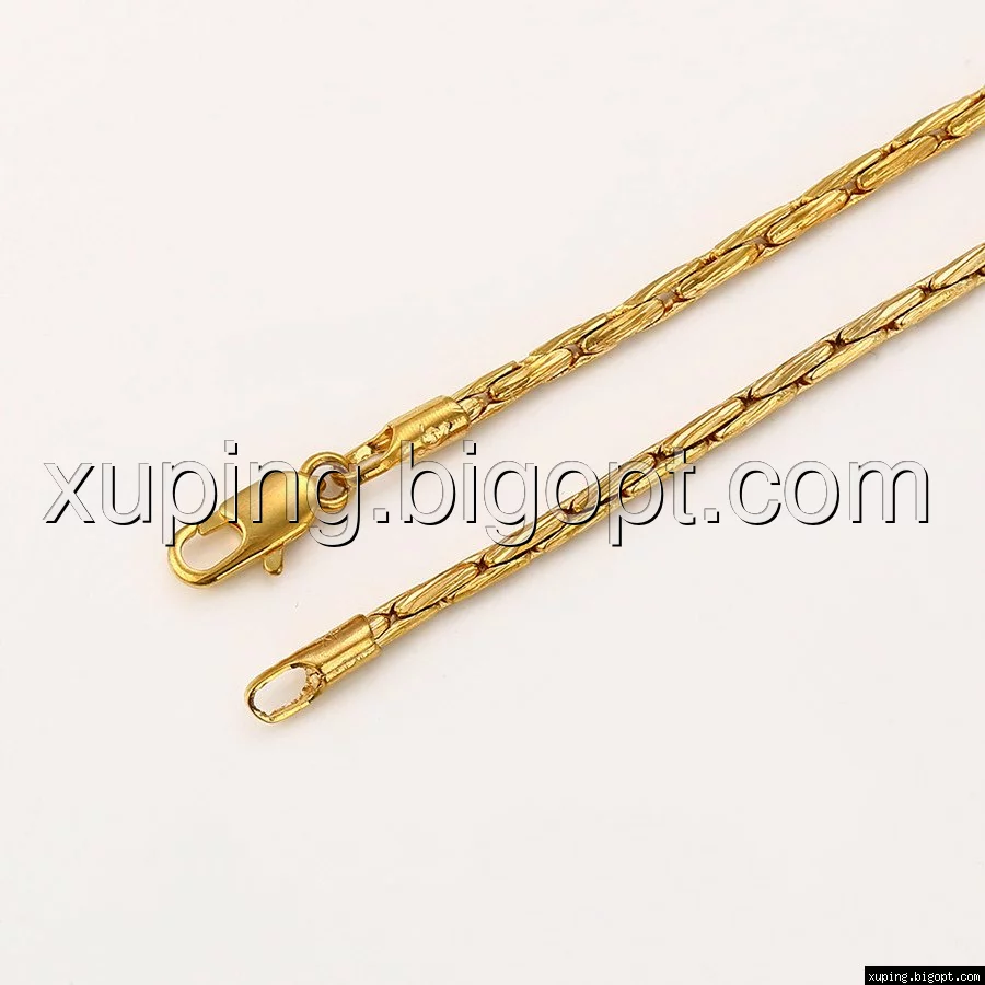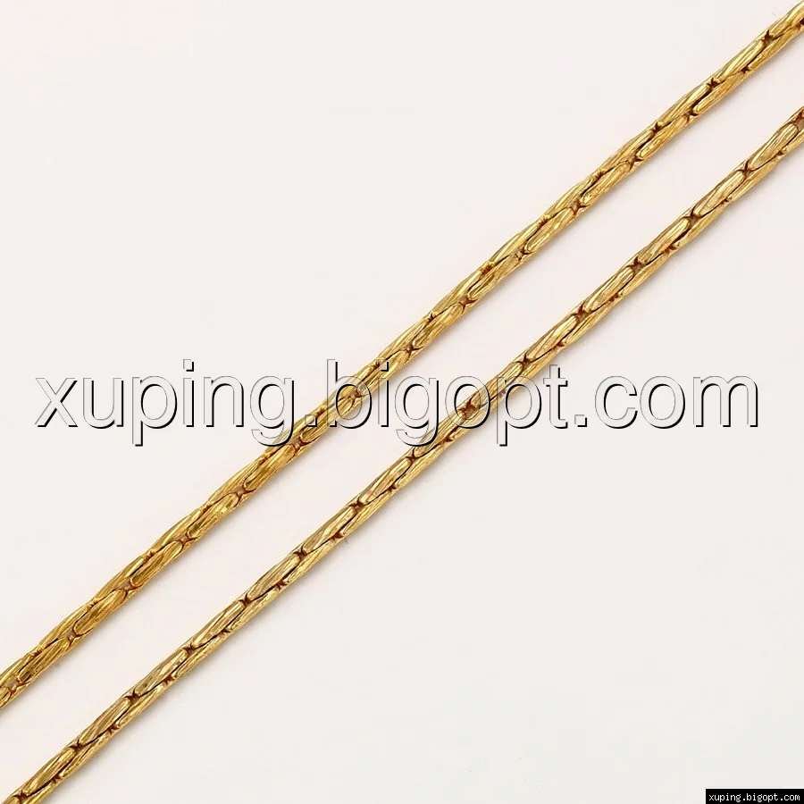 Цепочка выполнена из медицинского сплава на основе латуни с добавлением легирующих элементов, с целью улучшения каких-либо ее свойств, например коррозионной стойкости или прочности. Такой сплав не вызывает аллергии, не вступает в реакцию с потом человека, не меняет свои свойства под воздействием соленой воды и солнца. Поверхность цепочки покрыта золотом 18 карата.