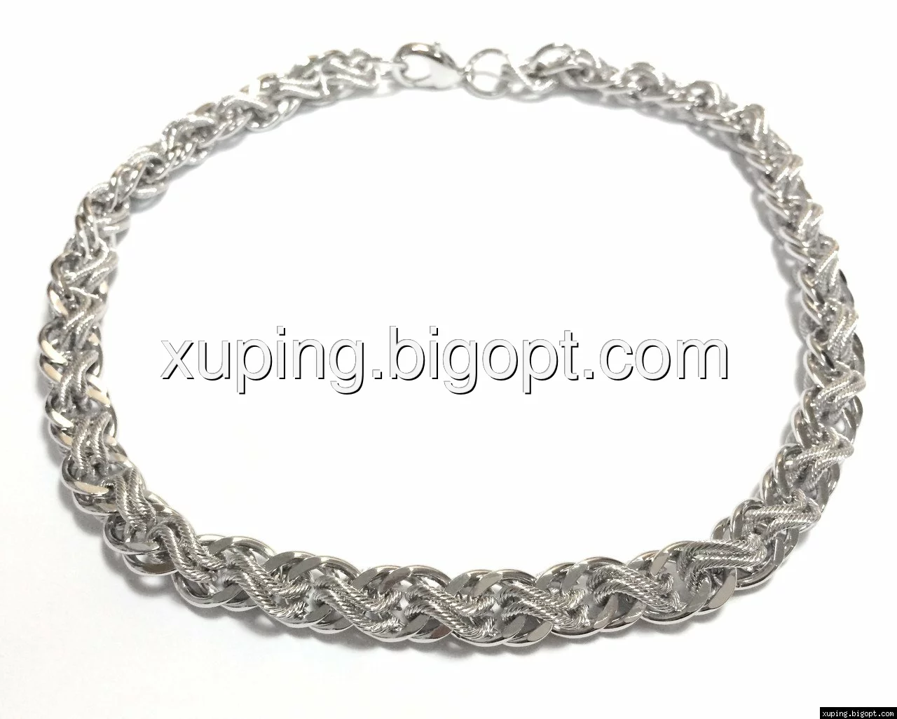 Цепочка выполнена из медицинского сплава на основе титана с добавлением легирующих елементов, с целью улучшения каких-либо ее свойств, например коррозионной стойкости или прочности. Такой сплав не вызывает аллергии, не вступает в реакцию с потом человека, не меняет свои свойства под воздействием соленой воды и солнца. Поверхность цепочки покрыта родием чтобы придать ей ярко-белый цвет и дополнительно защитить от повреждений .