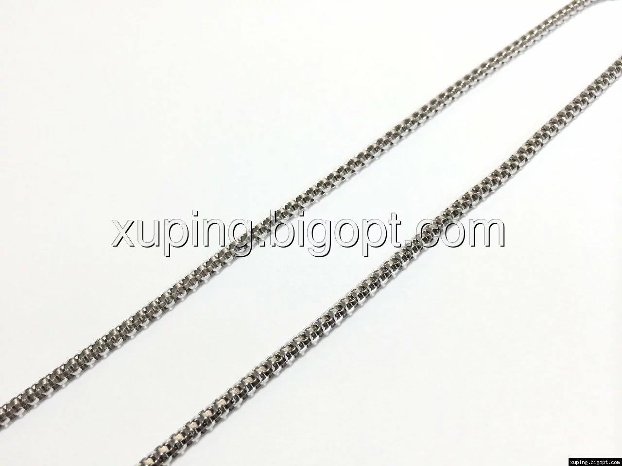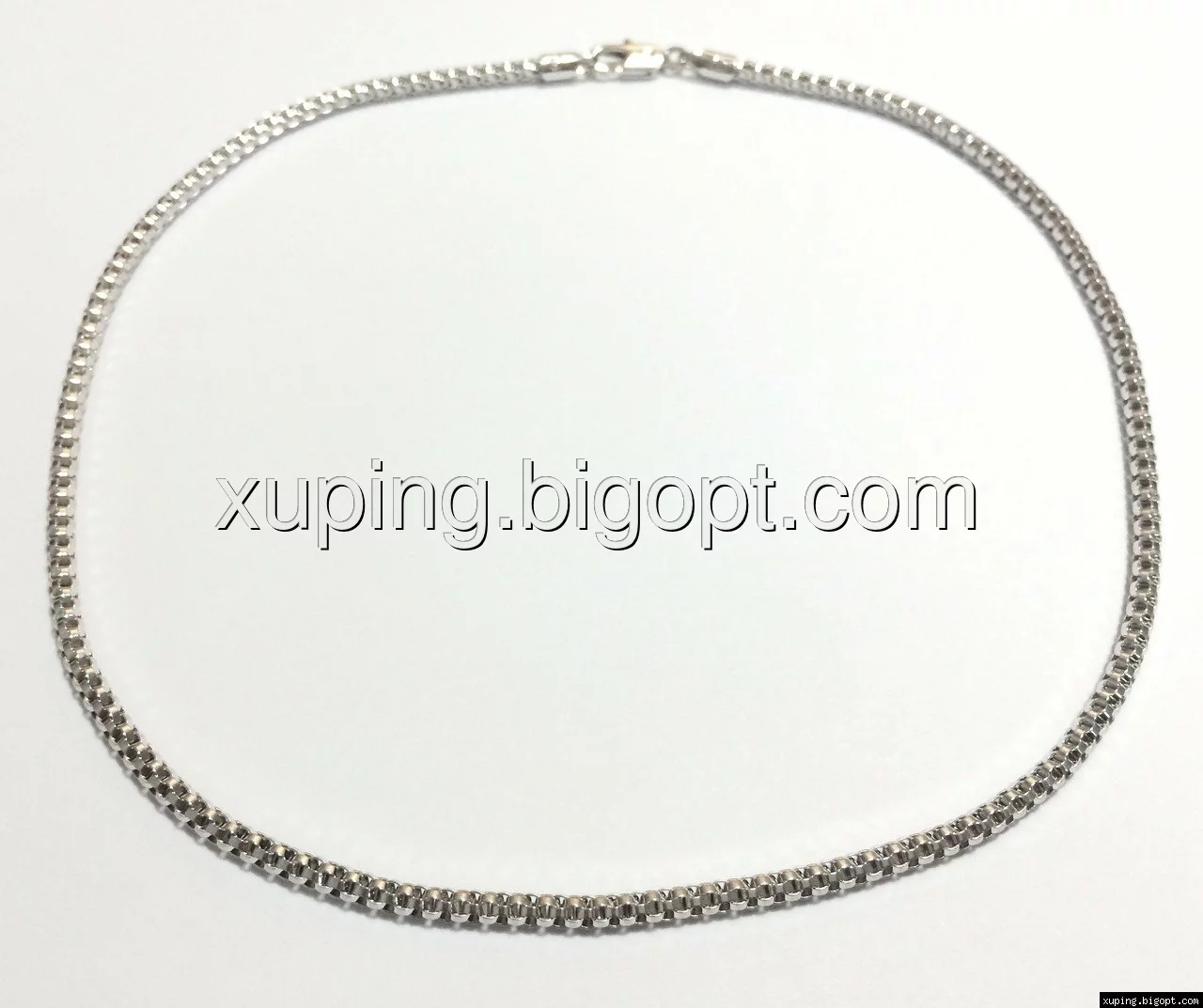 Цепочка выполнена из медицинского сплава на основе титана с добавлением легирующих елементов, с целью улучшения каких-либо ее свойств, например коррозионной стойкости или прочности. Такой сплав не вызывает аллергии, не вступает в реакцию с потом человека, не меняет свои свойства под воздействием соленой воды и солнца. Поверхность цепочки покрыта родием чтобы придать ей ярко-белый цвет и дополнительно защитить от повреждений .