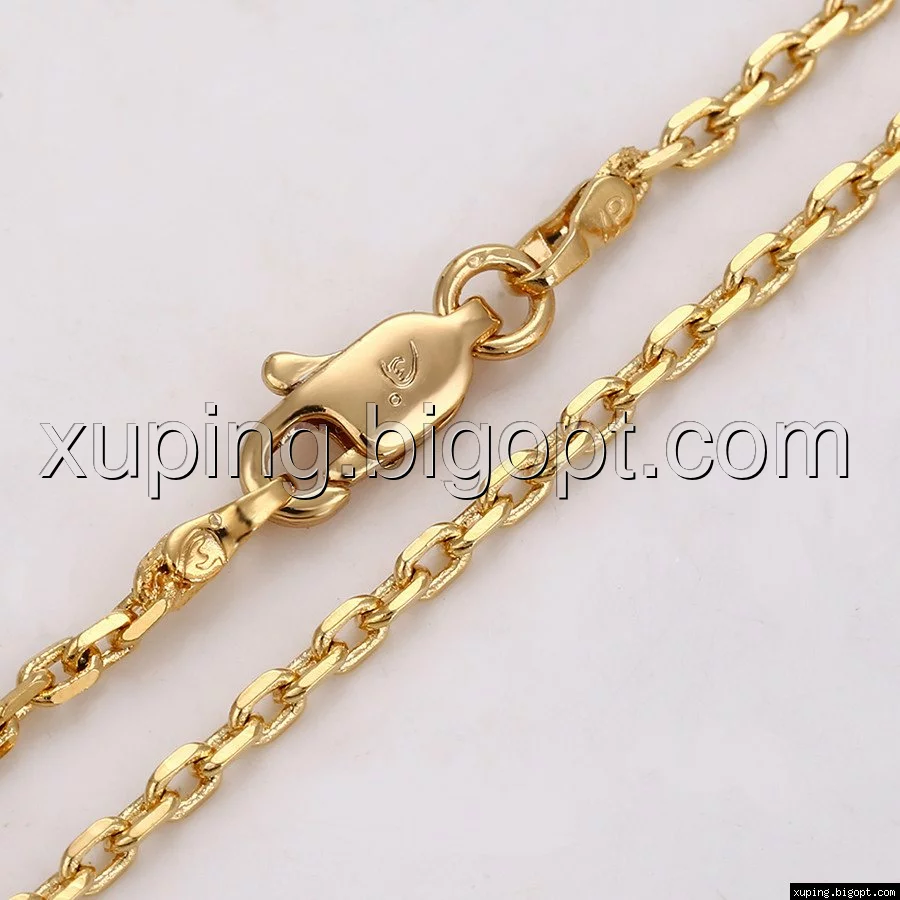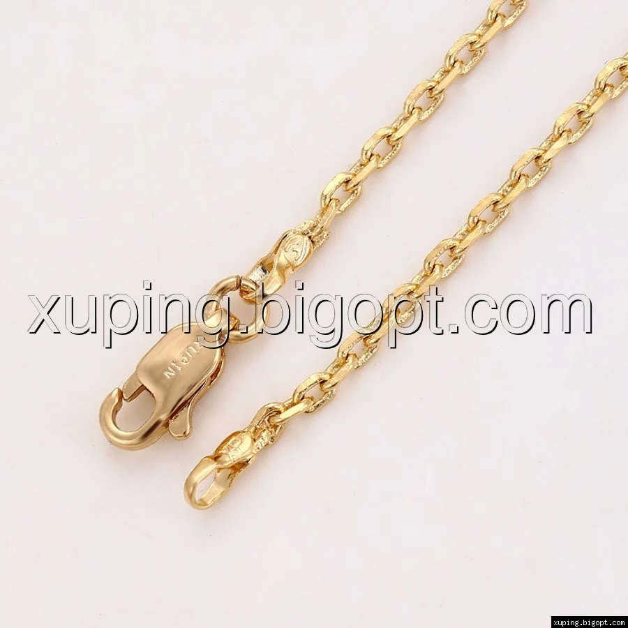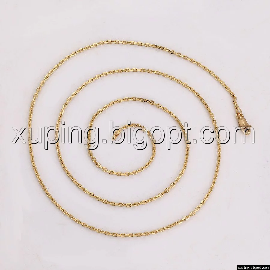 Цепочка выполнена из медицинского сплава на основе латуни с добавлением легирующих элементов, с целью улучшения каких-либо ее свойств, например коррозионной стойкости или прочности. Такой сплав не вызывает аллергии, не вступает в реакцию с потом человека, не меняет свои свойства под воздействием соленой воды и солнца. Поверхность цепочки покрыта золотом 18 карата.