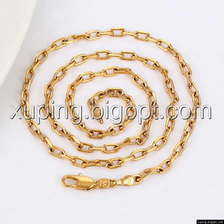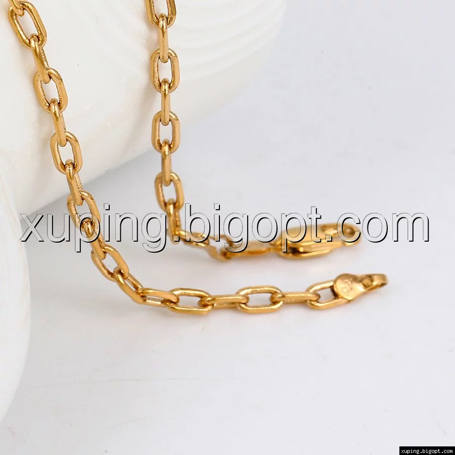 Цепочка выполнена из медицинского сплава на основе латуни с добавлением легирующих элементов, с целью улучшения каких-либо ее свойств, например коррозионной стойкости или прочности. Такой сплав не вызывает аллергии, не вступает в реакцию с потом человека, не меняет свои свойства под воздействием соленой воды и солнца. Поверхность цепочки покрыта золотом 18 карата.